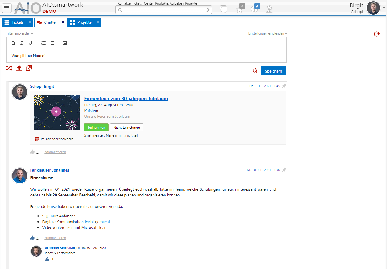 Kommunikation ist AIO! Informationen werden rasch und zielführend per Mitarbeiterübersicht verteilt. Dialoge, Infomeldungen und Benachrichtigungen sind einzeln, im Team oder Unternehmen möglich. Eine Veranstaltungsübersicht macht Events sichtbar und unterstützt die Planung. Der Chatter dient als schwarzes Brett und informiert übergreifend auch mehrere Standorte.