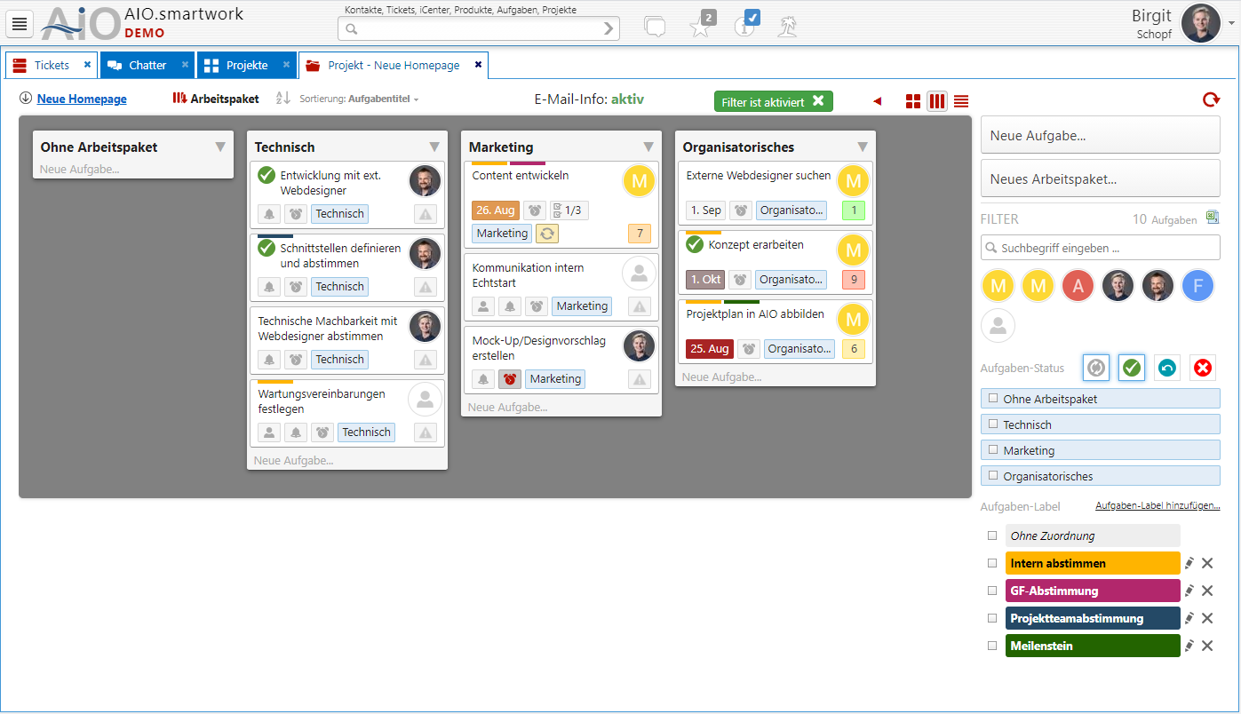 Mit AIO.smartwork ist jeder im Team auf dem aktuellen Stand. Alle notwendigen Informationen zum jeweiligen Meilenstein und zum Bearbeitungsprozess sind einseh- und abrufbar. Arbeitspakete, Aufgaben-Status und Label, Termine und Dringlichkeiten werden einfach festgelegt und überprüft. Genauso flexibel ist die Ansicht und die umfangreichen Filtermöglichkeiten.