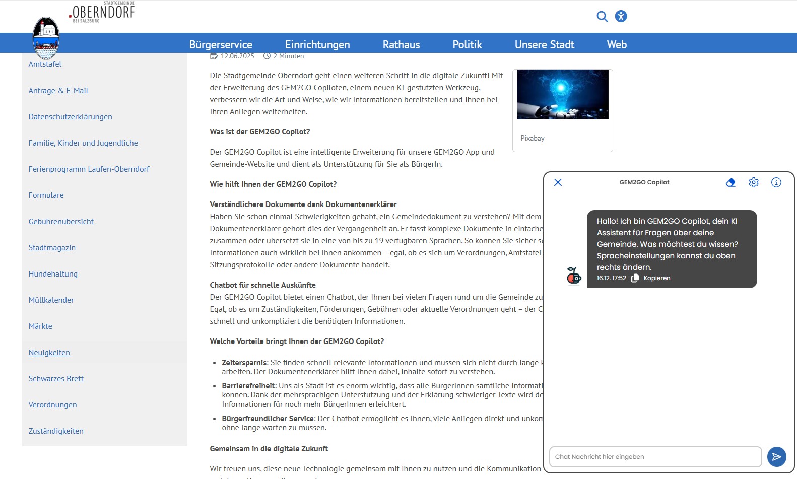 - Auch den BürgerInnen hilft der Copilot und zwar in Form eines Chatbots auf der Website, der Texte übersetzt und Informationen teilt.